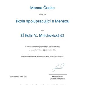 🎓 Naše škola získala titul „Škola spolupracující s Mensou“! Mensa je organizace sdružující nadprůměrně inteligentní lidi a podporující rozvoj talentu. S Mensou spolupracujeme již několik let, což nám pomáhá rozvíjet … » Zobrazit celý příspěvek