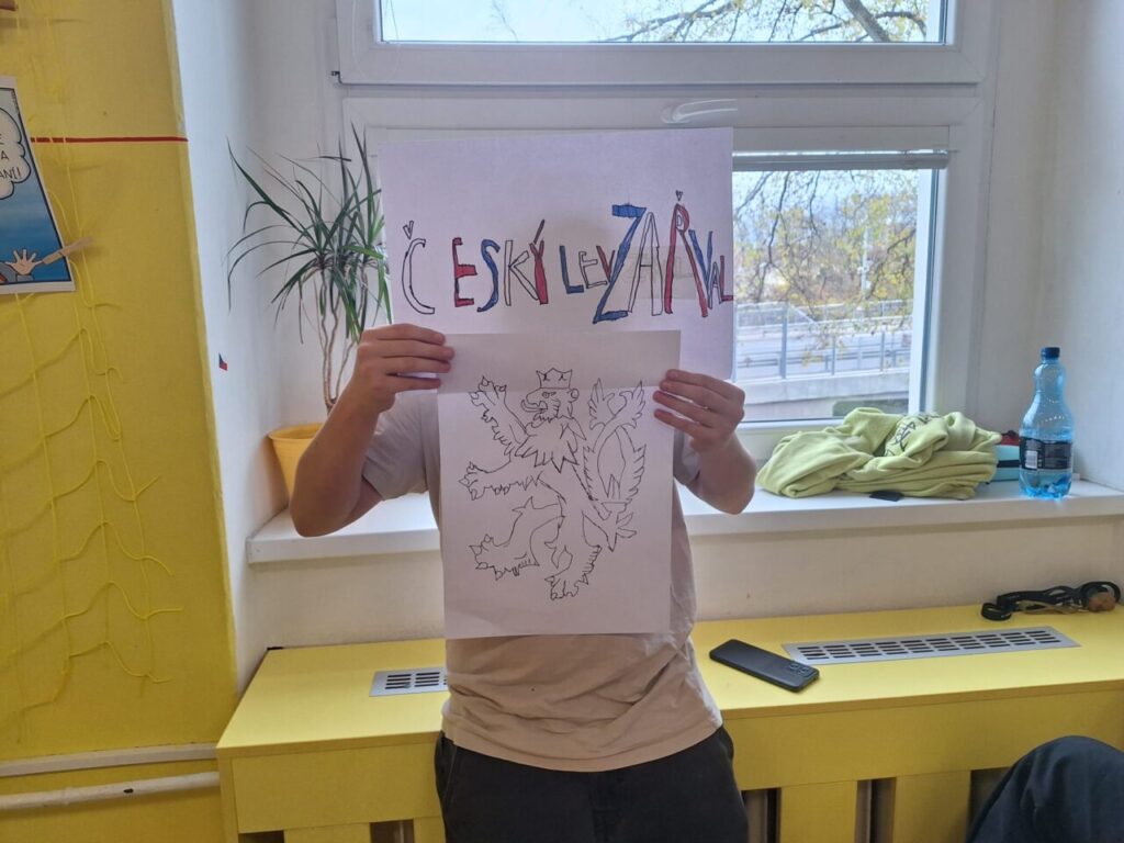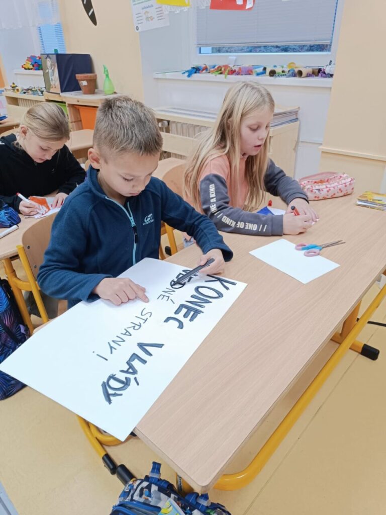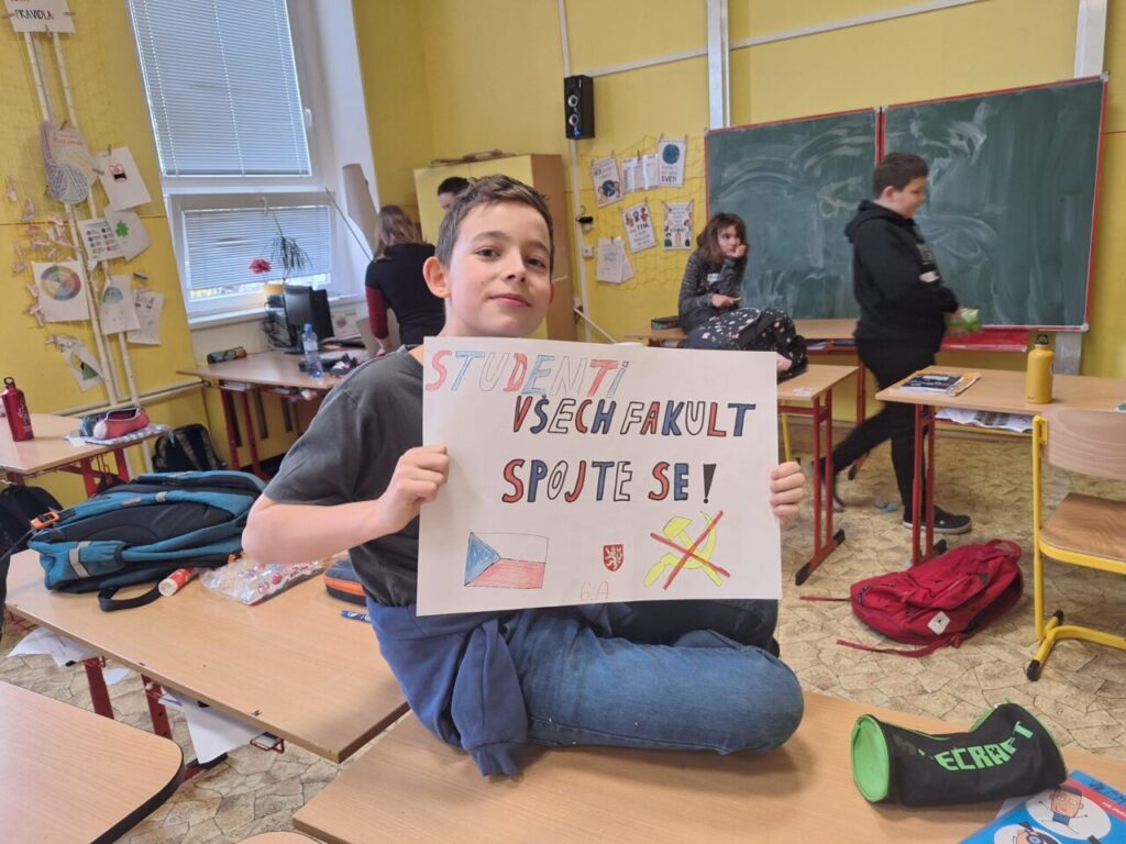 O třídnické hodině jsme si připravili vlajky a transparenty s hesly, která se tehdy v ulicích objevovala.