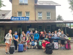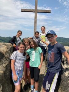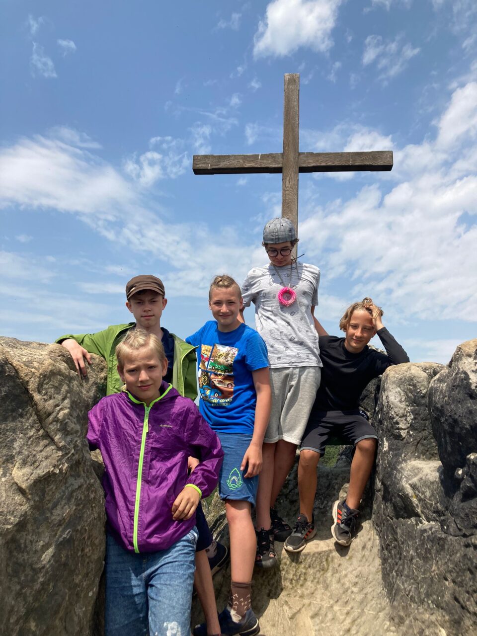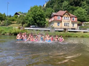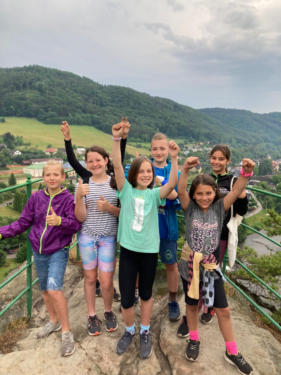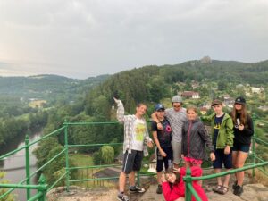 V pondělí 20. 6. jsme během výletu okusili všechny typy počasí. Po ranním příjemném dešti jsme za slunečného počasí vystoupali na vyhlídku nad Jizerou, prolezli skalní hrad Vranov. Při hledání šifrovaných úkolů bylo zataženo. Koupání bylo přerušeno obrovskou průtrží mračen, během které jsme se pod střechou občerstvili. Déšť ustal těsně před nutným odchodem na nádraží.