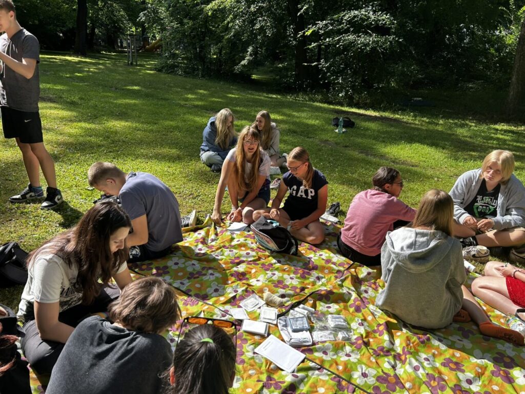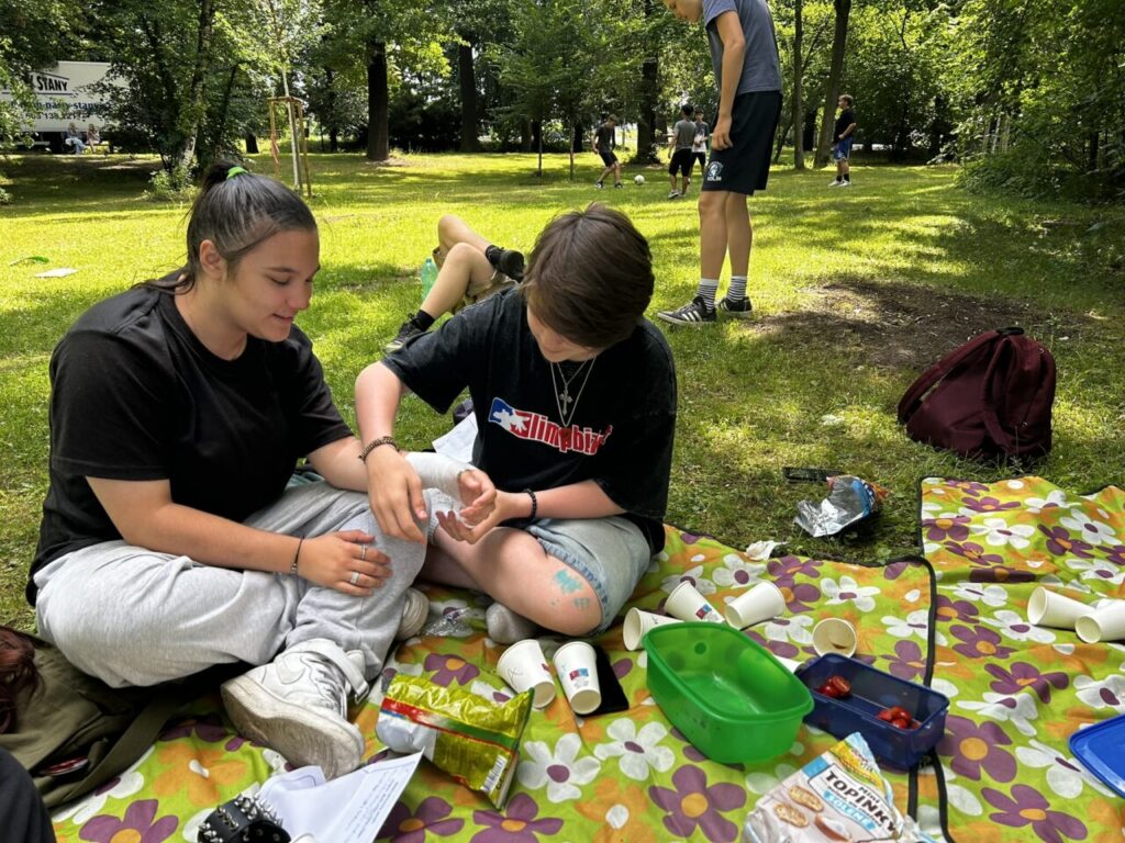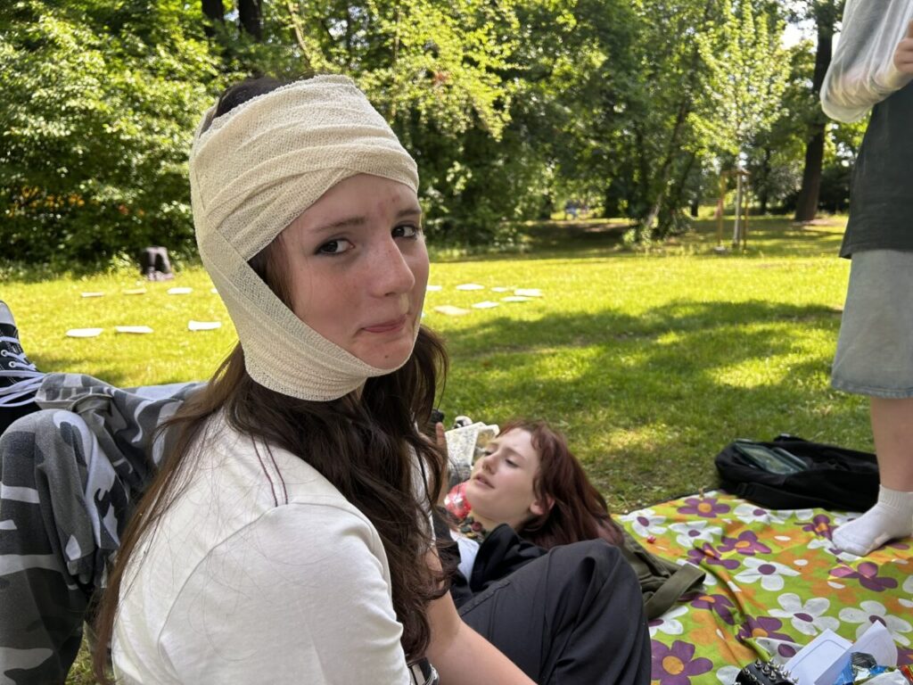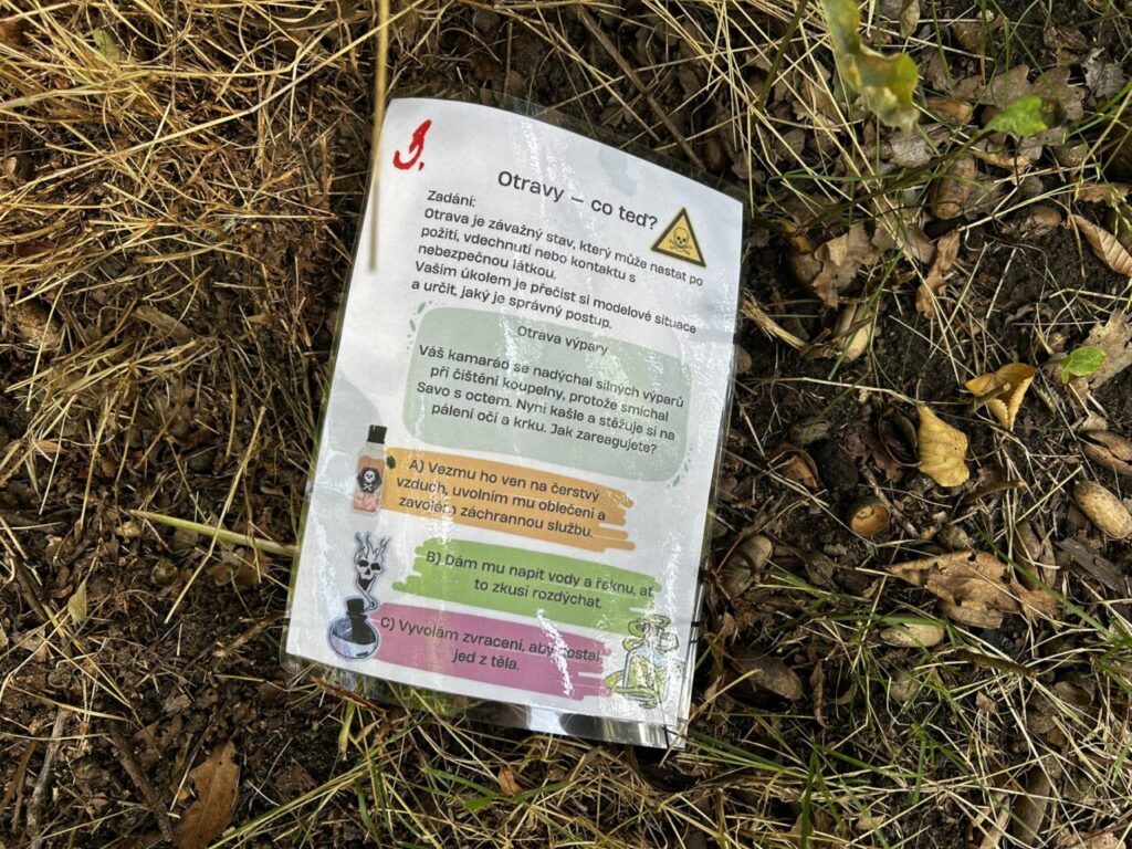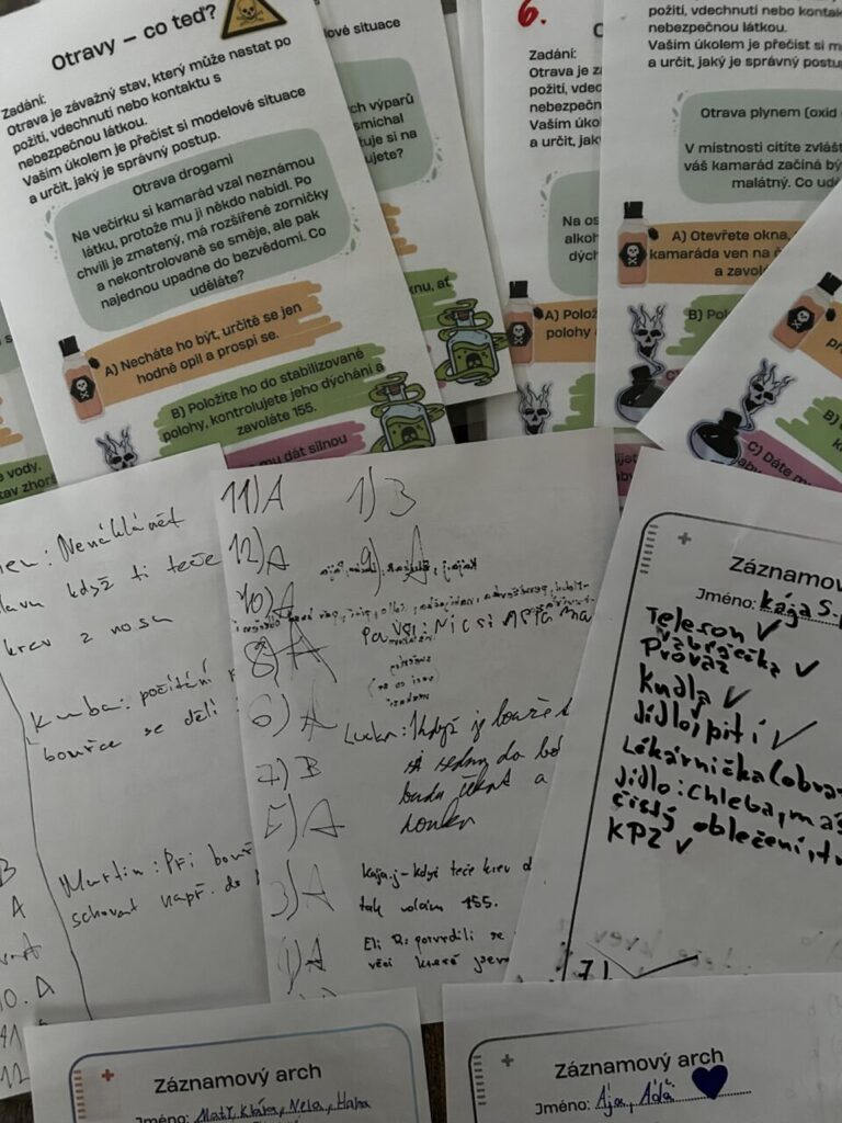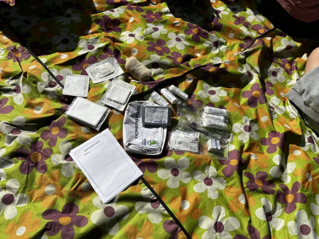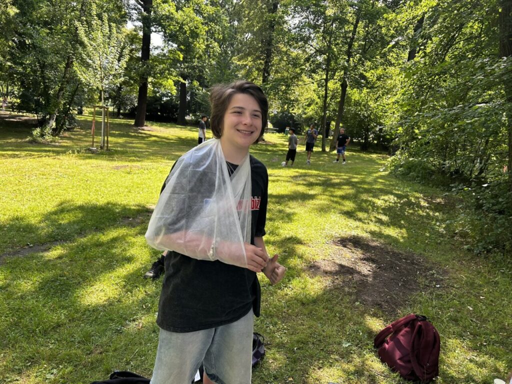 V úterý 24. 6. 2025 jsme celé dopoledne strávili venku. Věnovali jsme se problematice ochraně člověka za mimořádných událostí. Společně jsme se pobavili, jak se chránit a chovat při bouřce, připomněli jsme si, co vše patří do evakuačního zavazadla. Na různých stanovištích si žáci ověřovali své znalosti ze základů zdravovědy, prakticky jsme si zkoušeli stabilizovanou polohu, první pomoc a techniky obvazování.