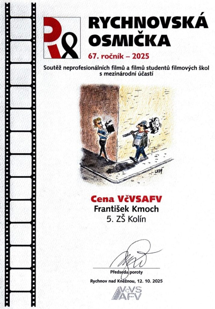 Od odborné poroty jsme slyšeli krásné hodnocení práce všech, kteří se na našich filmech ve škole podílejí – začínalo slovy: „Tak, vy jste ta úžasná základní škola…“ Máme velkou radost, že film František Kmoch získal speciální ocenění VčVSAFV, které uděluje Východočeské volné sdružení pro amatérský film a video, z. s.