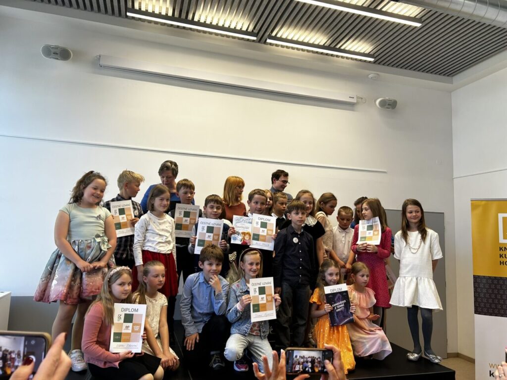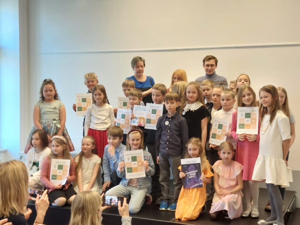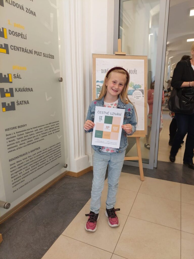 Velké poděkování k obrovskému úspěchu patří Terezii Pejsarové, žákyni 2. B. Ta prošla kolem třídním, školním, úspěšně kolem okresním, dostala se až do nejvyššího krajského kola, ve kterém úspěšně reprezentovala naši školu a získala Čestné ocenění od porotců za svůj přednes básně Čert a Káča od Michala Černíka.