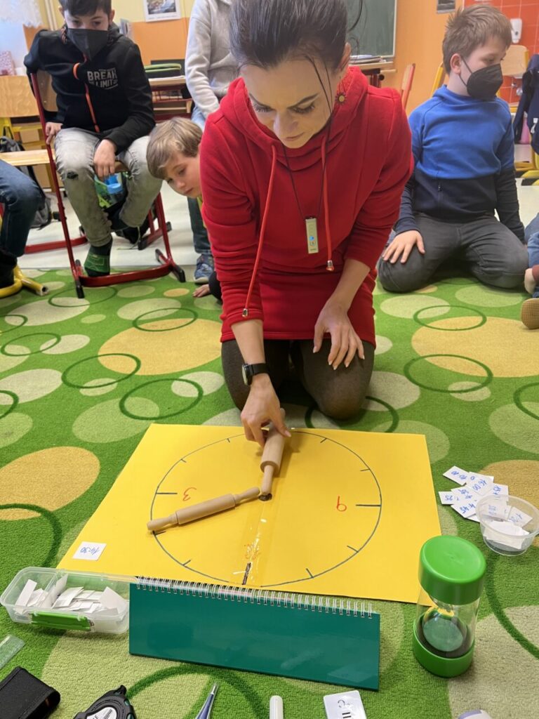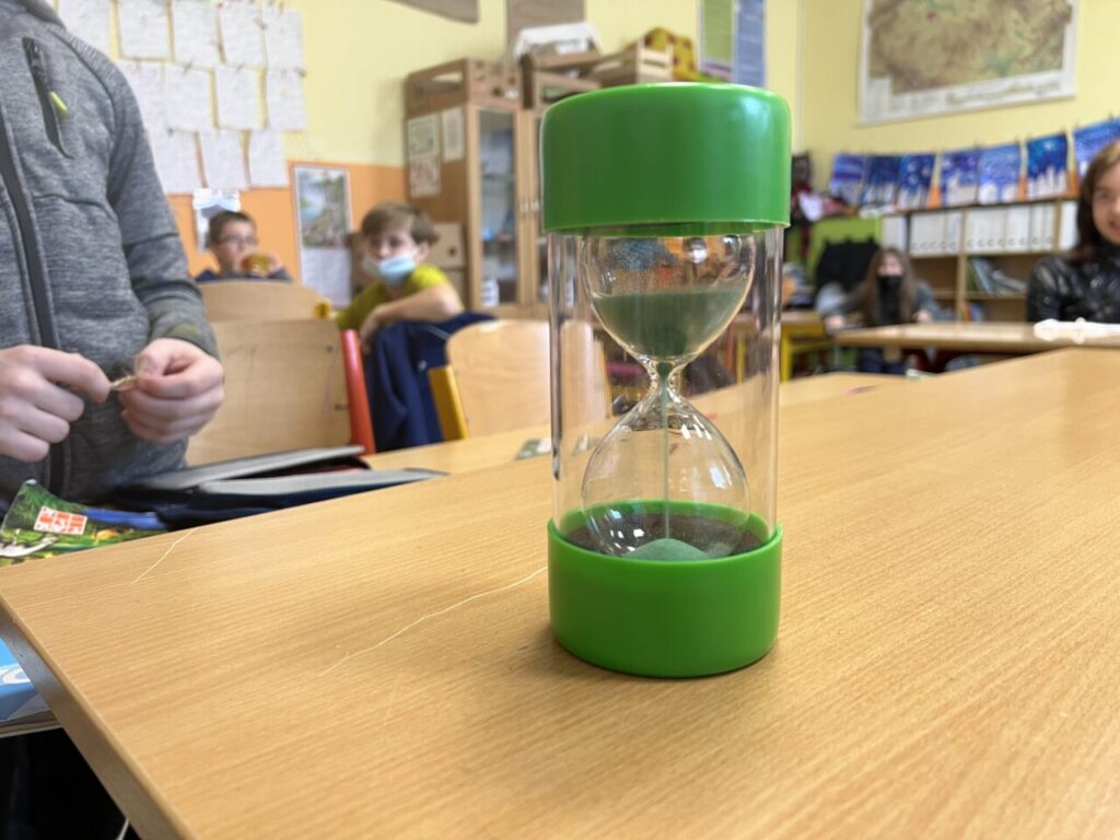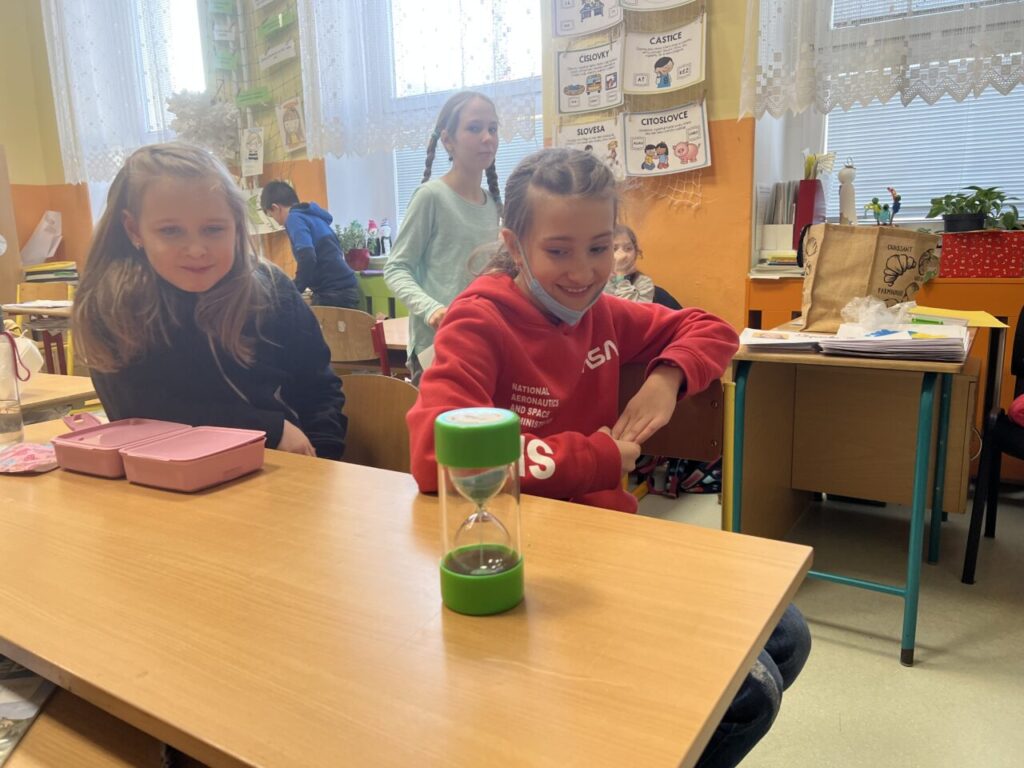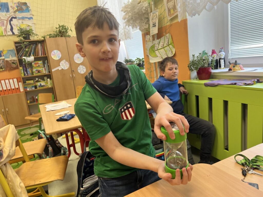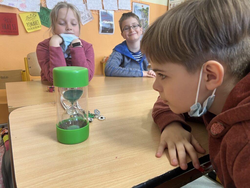 Více prostoru jsme také věnovali času, a to nejen na ciferníku analogových hodin, ale také pomocí přesýpacích hodin. Vyzkoušeli jsme si mluvit celou jednu minutu na dané téma (každý žák si vylosoval jiné). A nechybělo ani měření teploty.