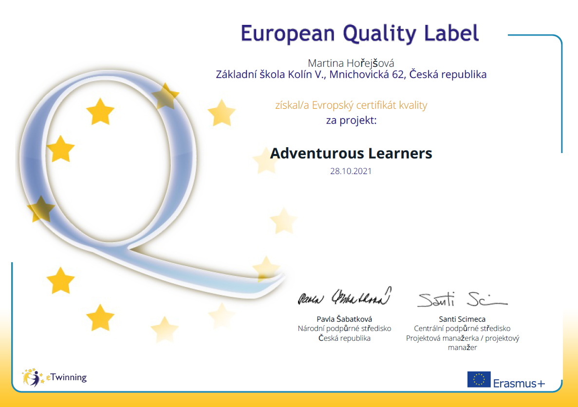 S radostí sdílíme obrovský úspěch: eTwinningový projekt ADVENTUROUS LEARNERS získal po ocenění kvality v národním měřítku (National Quality Label) i Evropskou cenu kvality – vysoce ceněnou European Quality Label. Toto ocenění je důkazem toho, že naše práce, práce studentů a celé školy odpovídá vysokým evropským měřítkům.