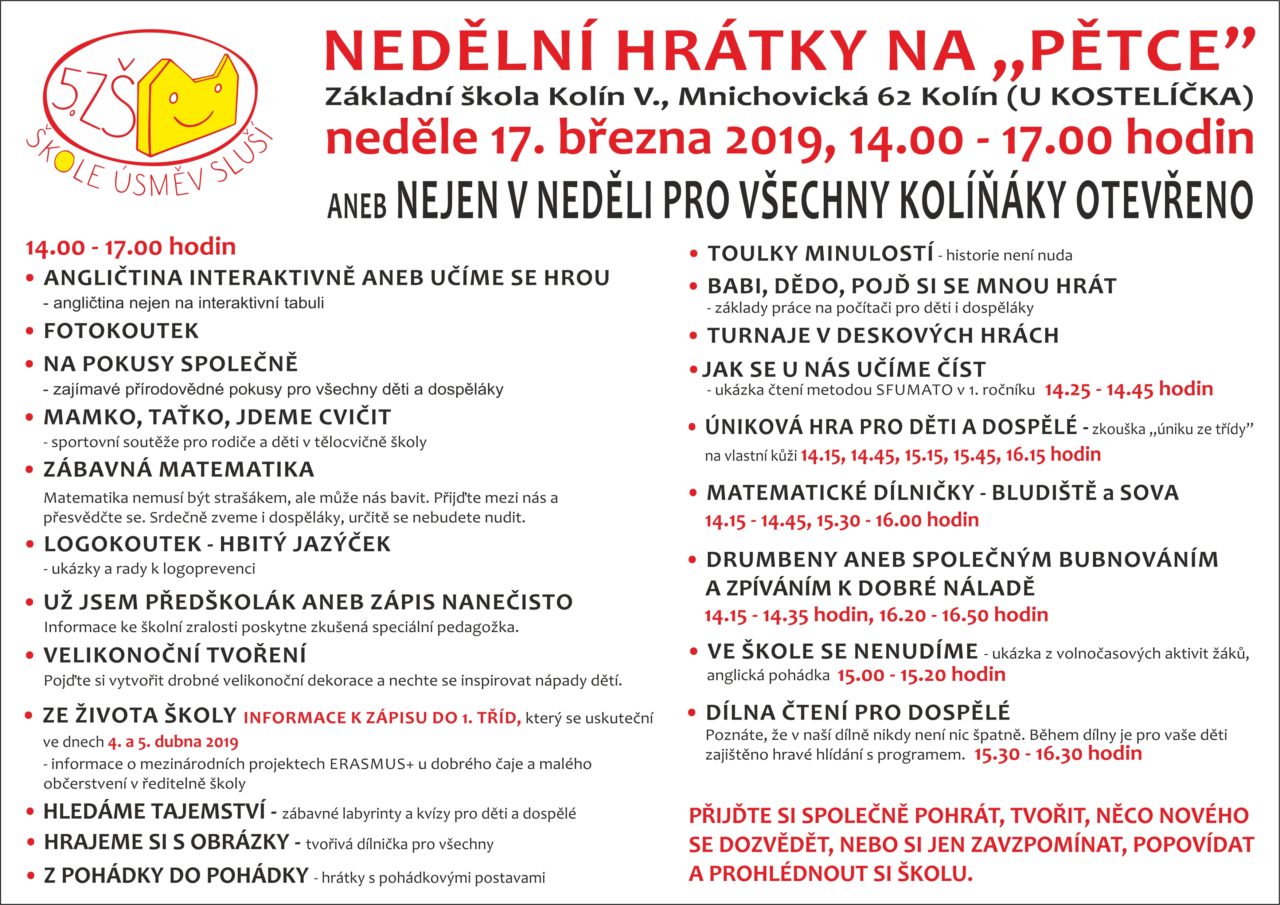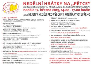 Zveme všechny na „NEDĚLNÍ HRÁTKY“, které se uskuteční 17. 3. 2019 od 14.00 -17.00. Čeká vás odpoledne plné tvořivých dílniček a soutěží.