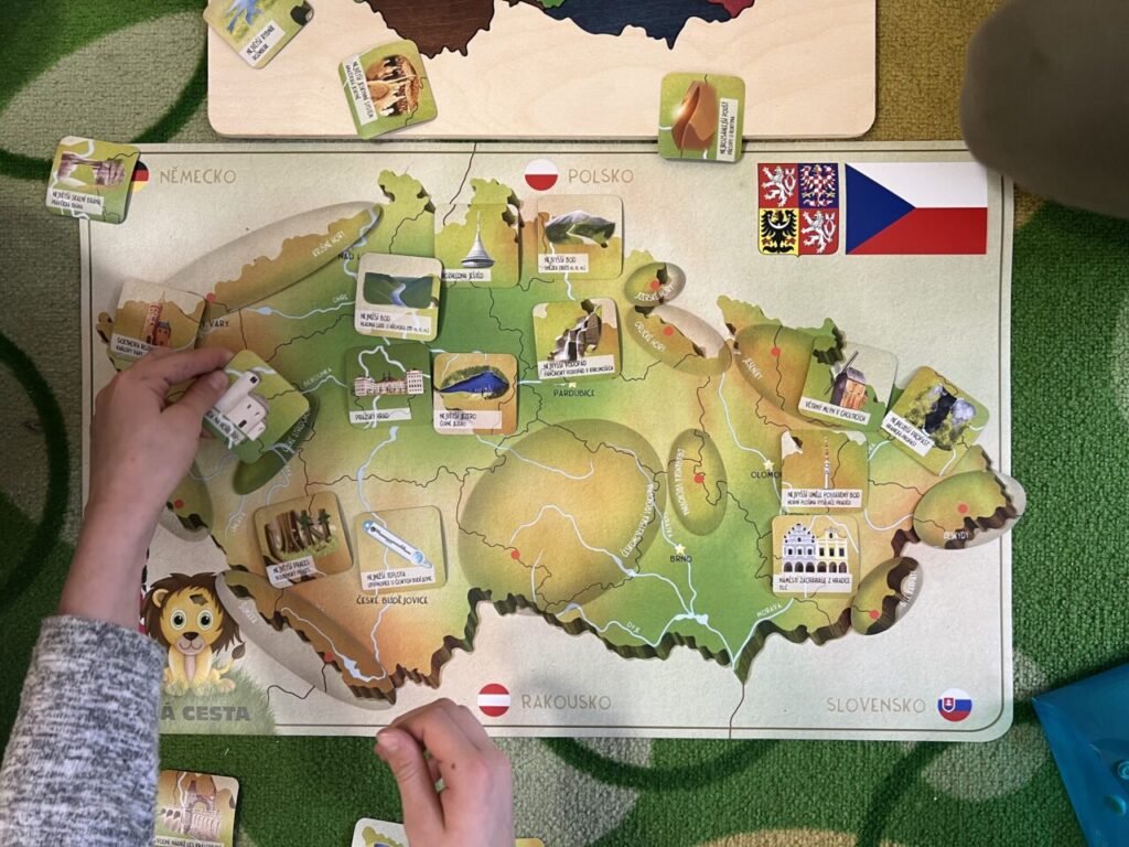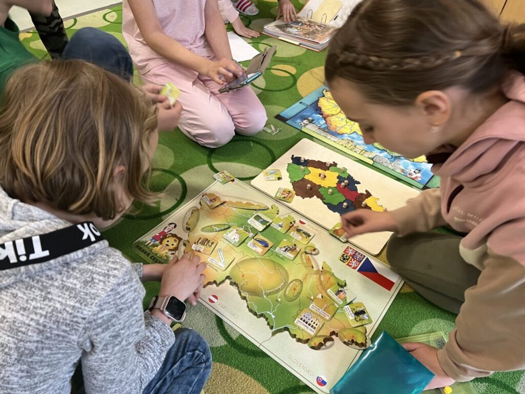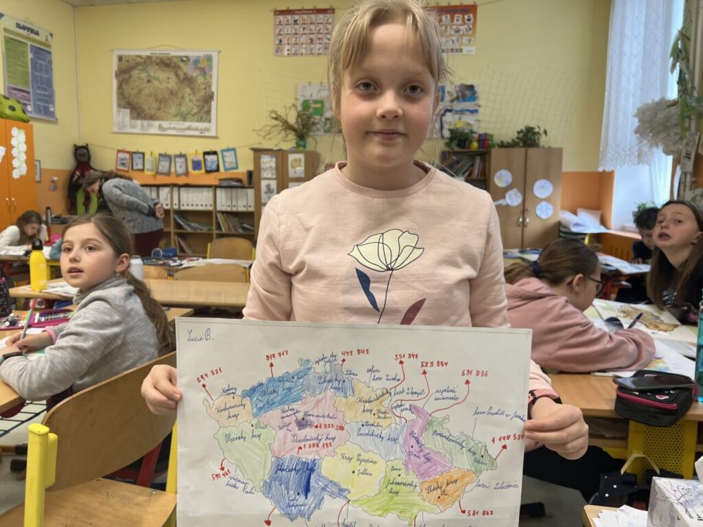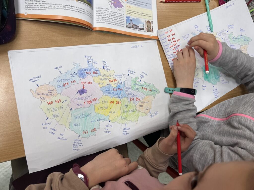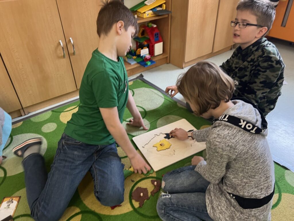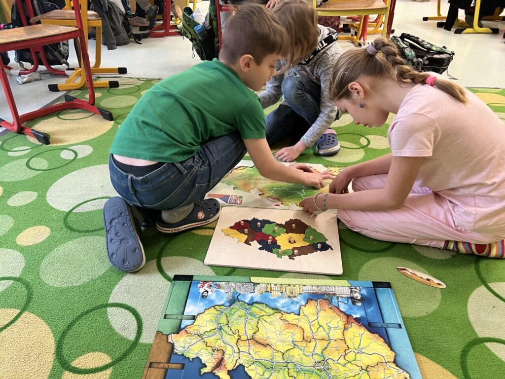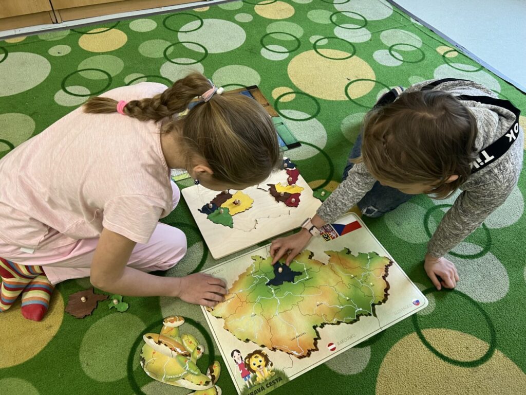 Začínáme pracovat s mapou – rozlišujeme jednotlivé kraje i pohoří v České republice. Děti samy dohledávají informace a data zapisují, zpracovávají. Využíváme učebnice, internet i Montessori pomůcky.