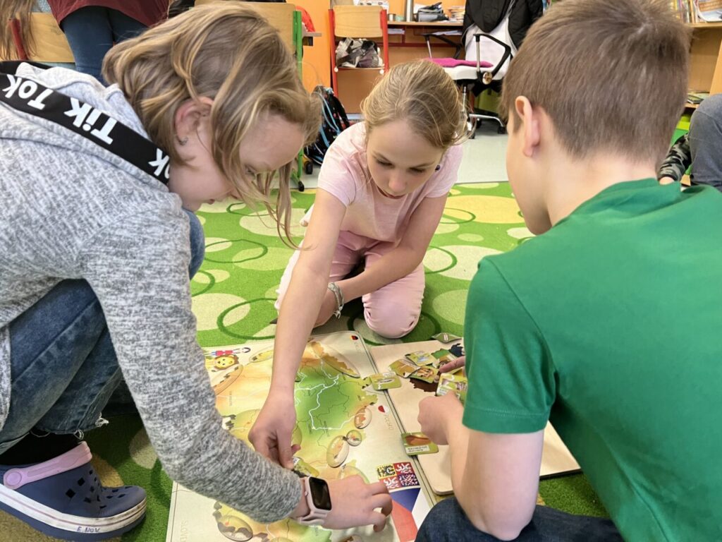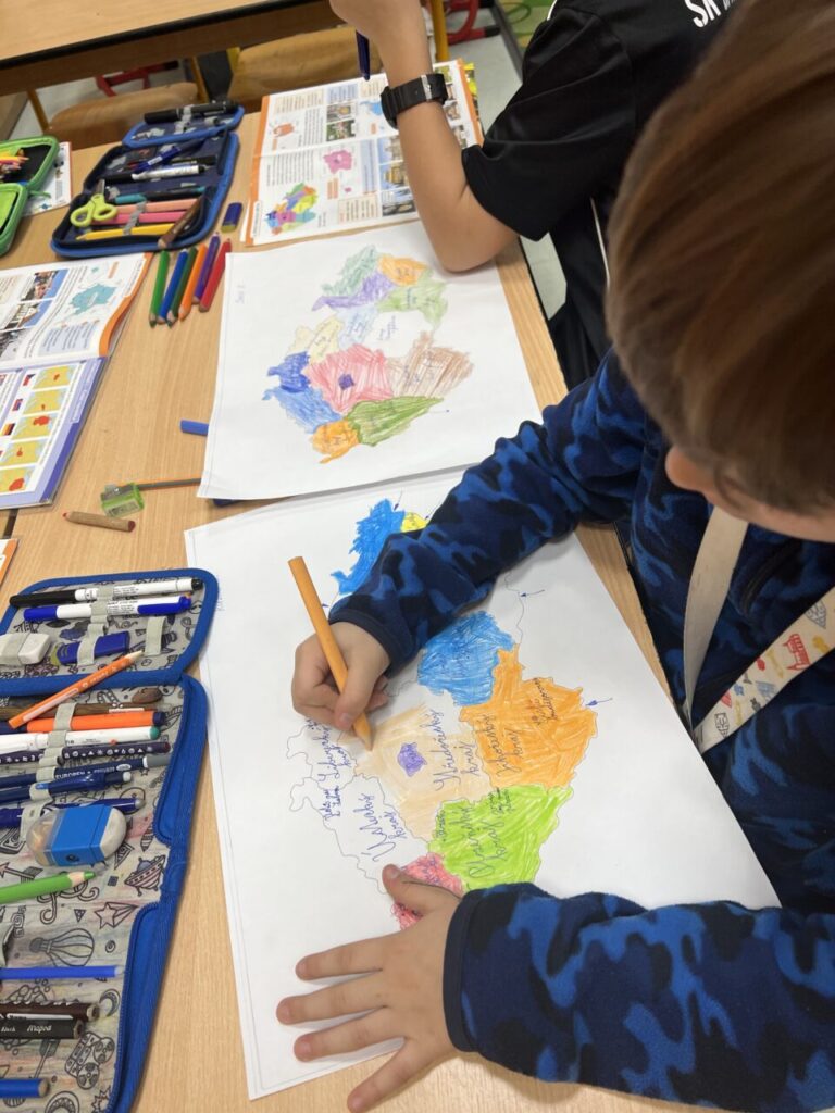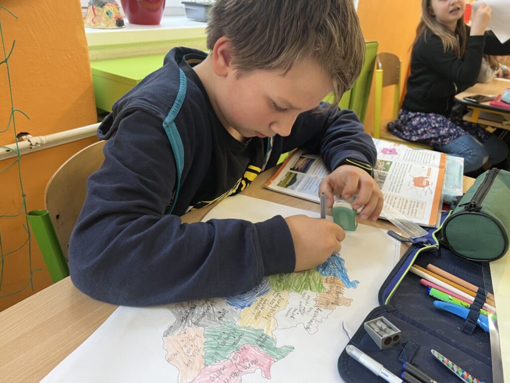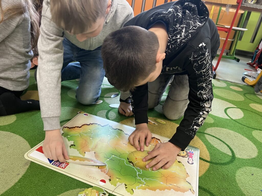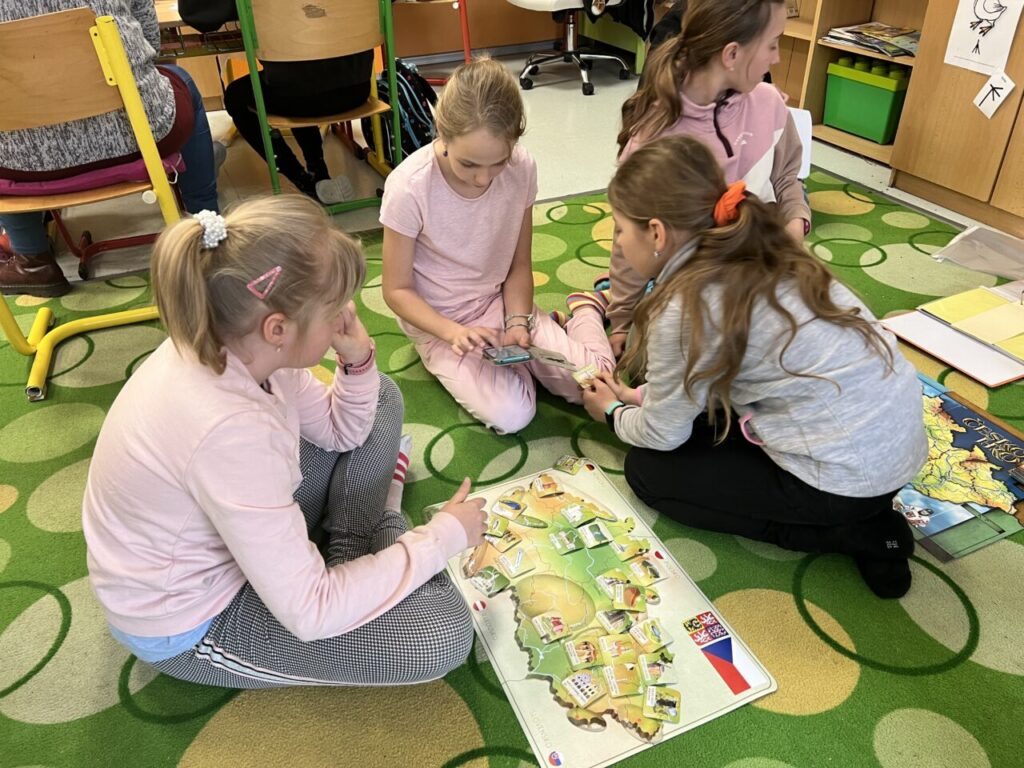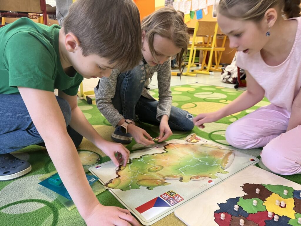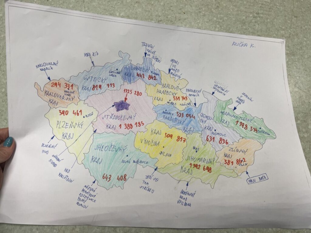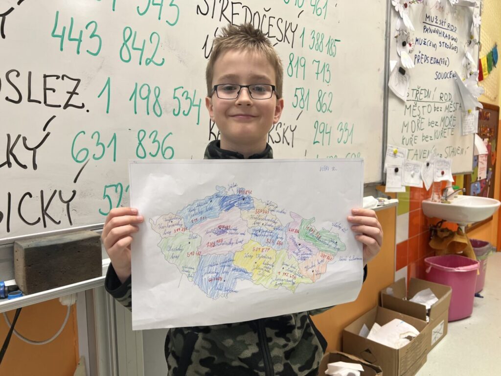 Začínáme pracovat s mapou – rozlišujeme jednotlivé kraje i pohoří v České republice. Děti samy dohledávají informace a data zapisují, zpracovávají. Využíváme učebnice, internet i Montessori pomůcky.