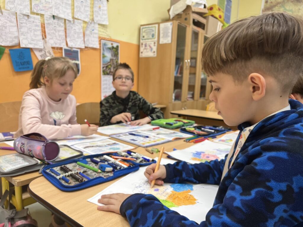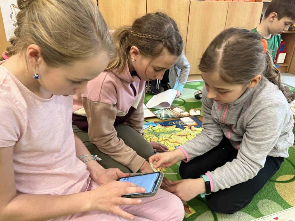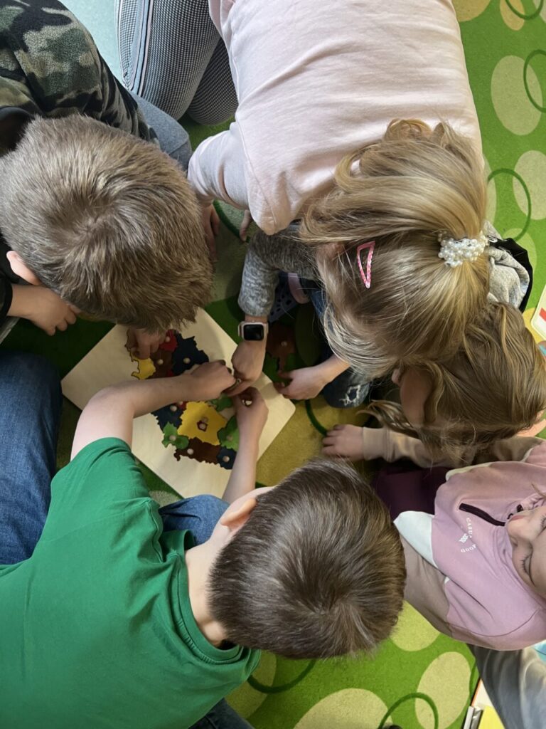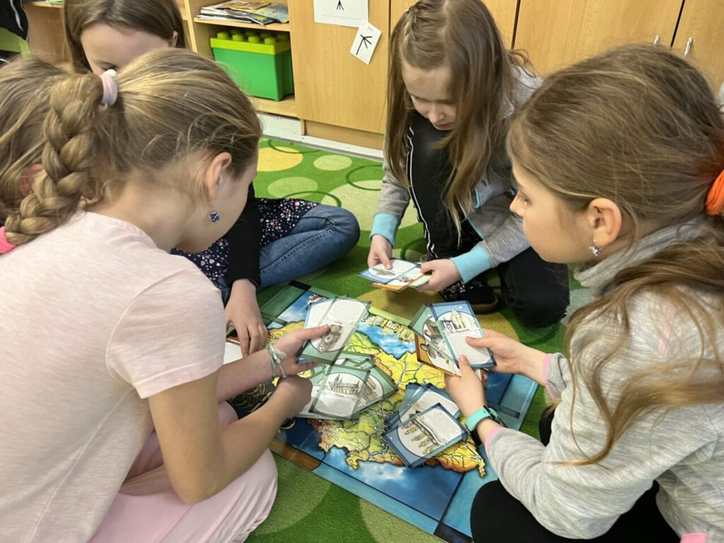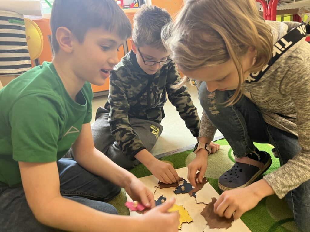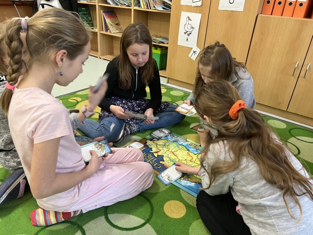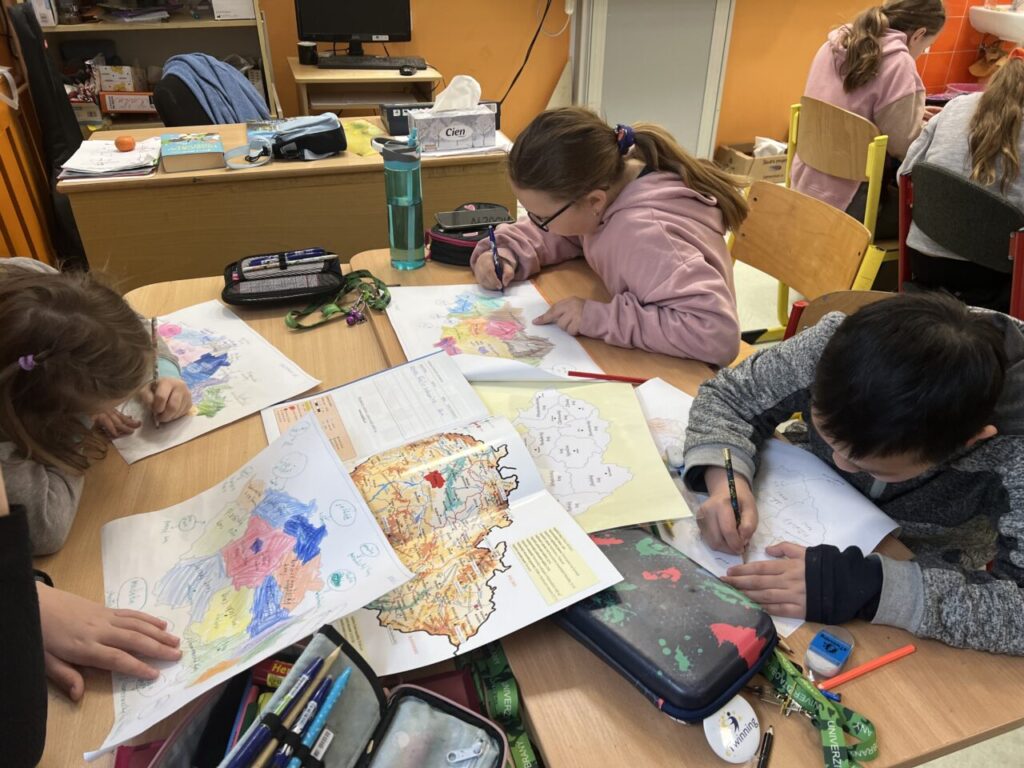 Začínáme pracovat s mapou – rozlišujeme jednotlivé kraje i pohoří v České republice. Děti samy dohledávají informace a data zapisují, zpracovávají. Využíváme učebnice, internet i Montessori pomůcky.