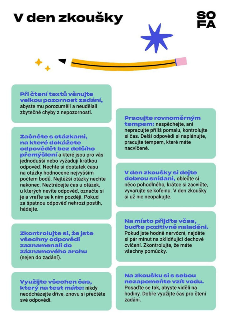 Hlavně buďte v klidu, dejte tomu svoje maximum a věřte si! I když to nevypadá, zvládnete to. A když náhodou něco neklapne, svět se nezboří – vždycky je cesta, jak z toho ven.