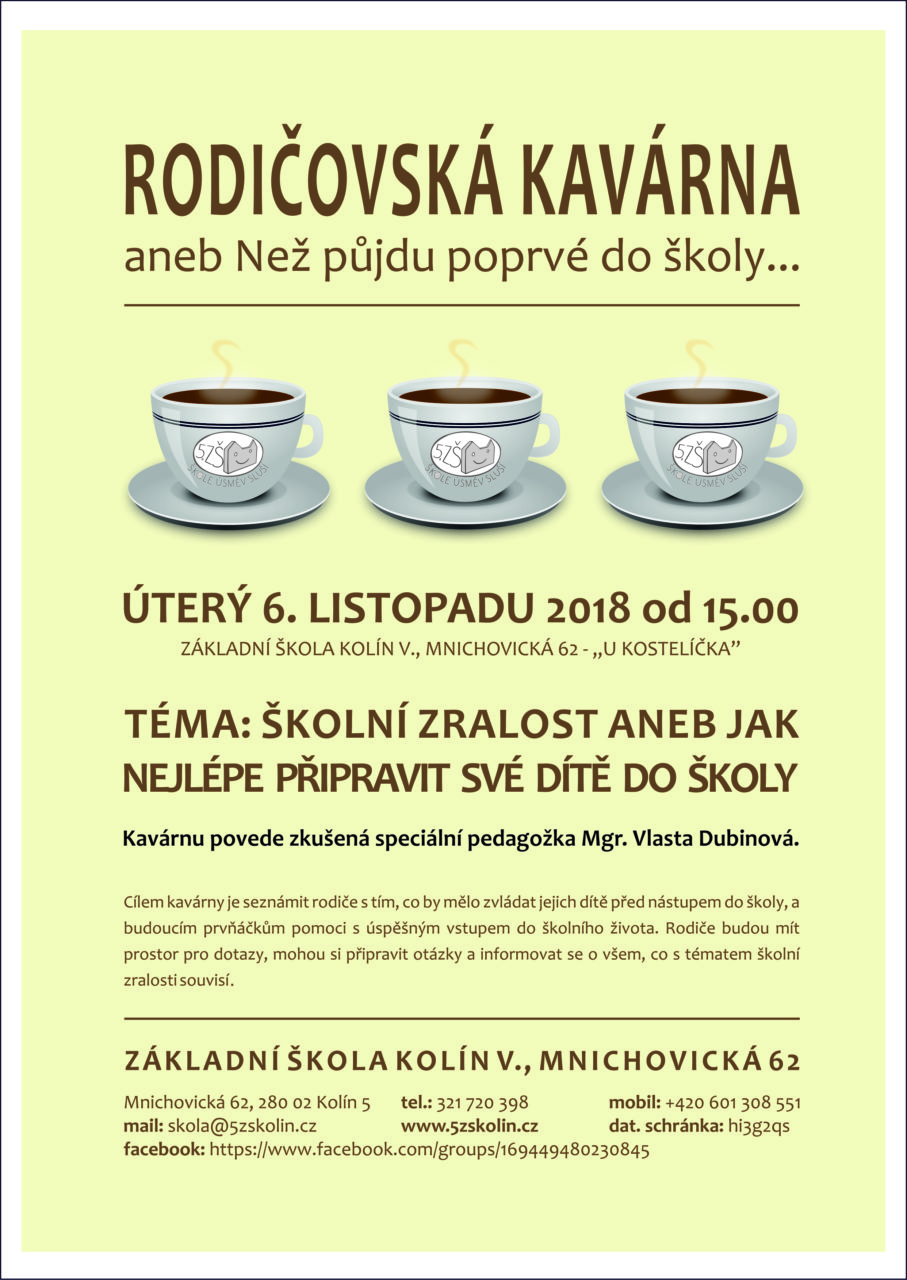 Zveme rodiče předškoláků na rodičovskou kavárnu na téma Jak nejlépe připravit své dítě do školy. Od 15.00 – 15.30 individuální konzultace se speciální pedagožkou. Kavárna od 15.30. Pro děti je připravena školička. Těšíme se na vás.