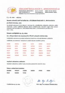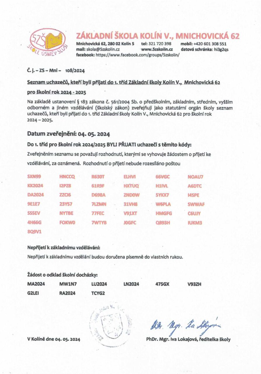 SEZNAM UCHAZEČŮ PŘIJATÝCH DO 1. TŘÍD ZÁKLADNÍ ŠKOLY KOLÍN V., MNICHOVICKÁ 62