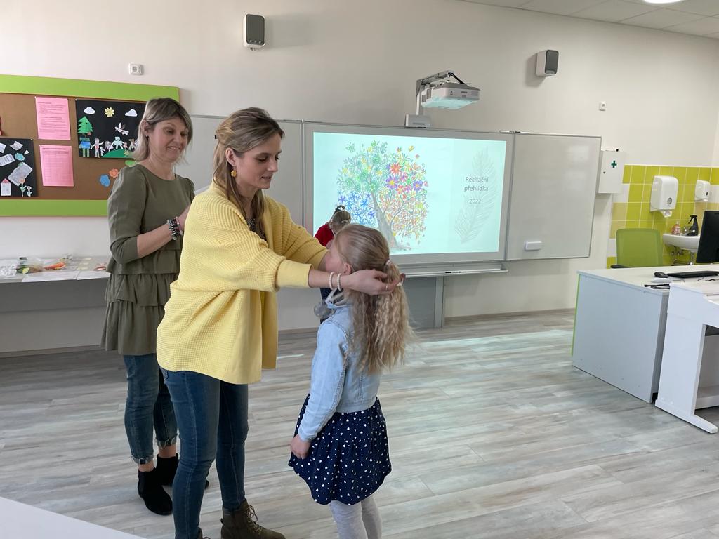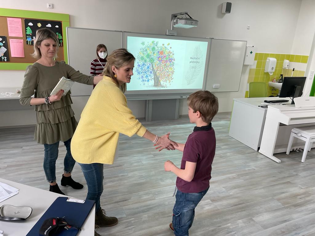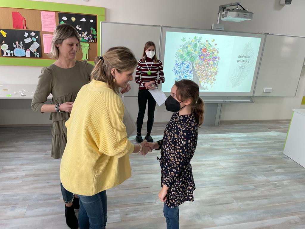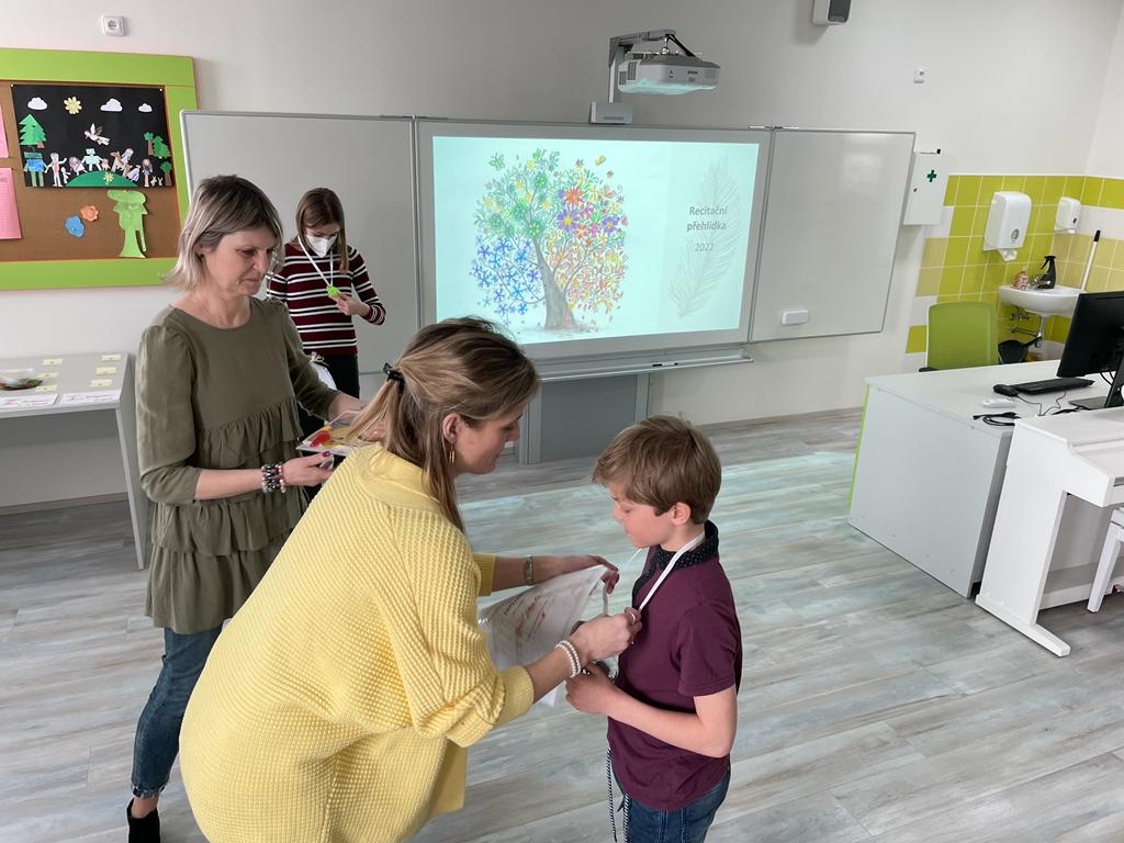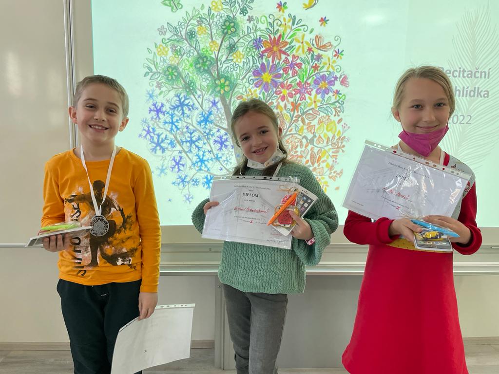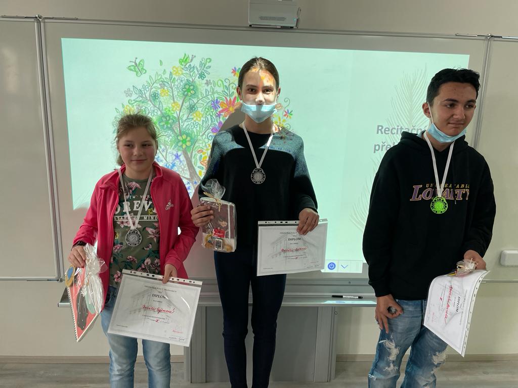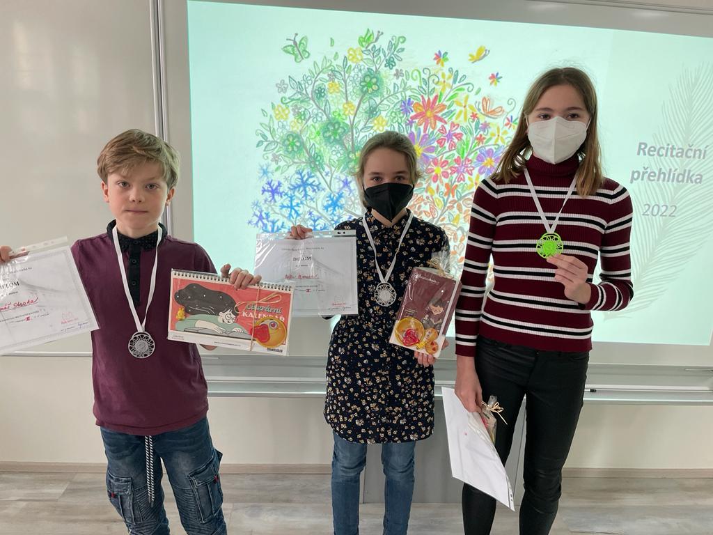 Ve čtvrtek 3. března se sešli vybraní žáci jednotlivých tříd, aby si zasoutěžili v přednesu básní ve školním kole recitační soutěže, kterému předcházela jednotlivá třídní kola. Celkem si své síly změřilo 45 recitátorů. Ti nejúspěšnější si odnášeli odměny v podobě diplomů, drobných dárků a především medailí, které pro tuto akci navrhli žáci devátých ročníků.