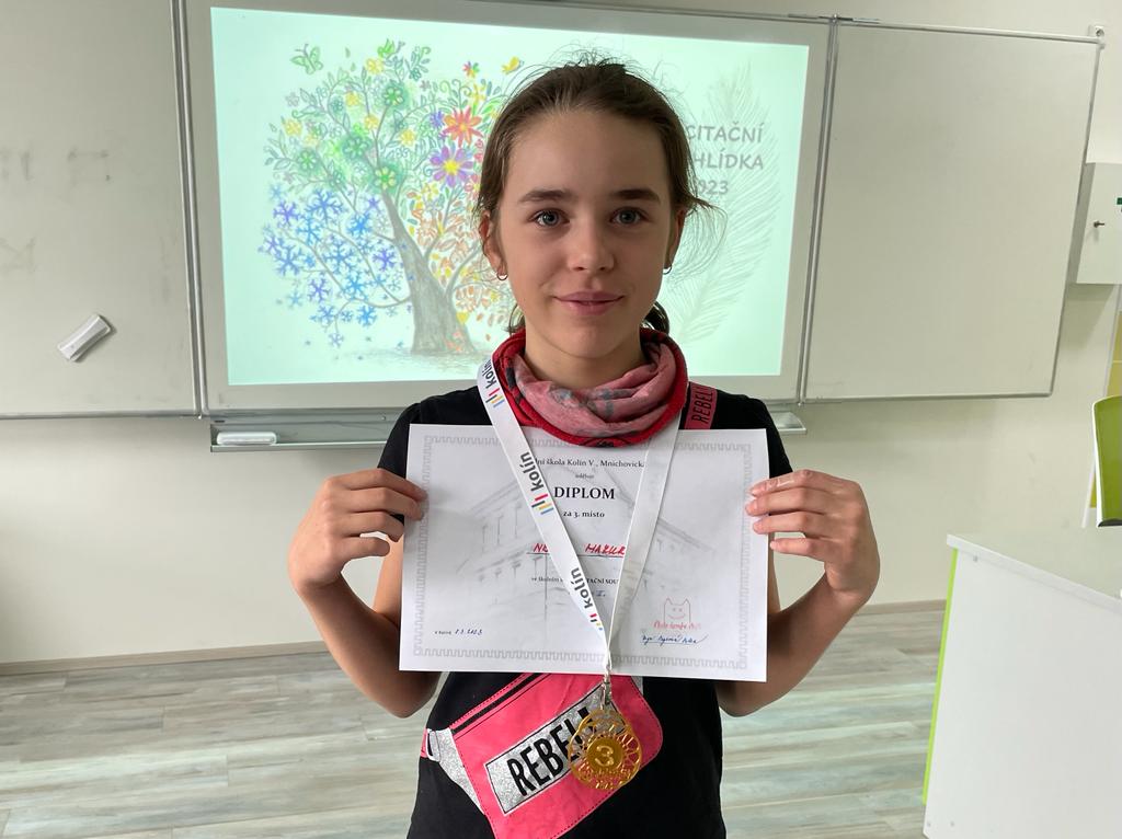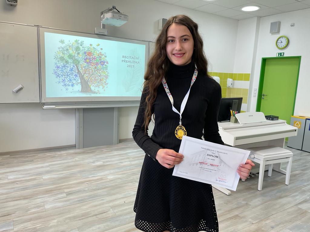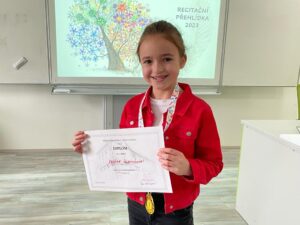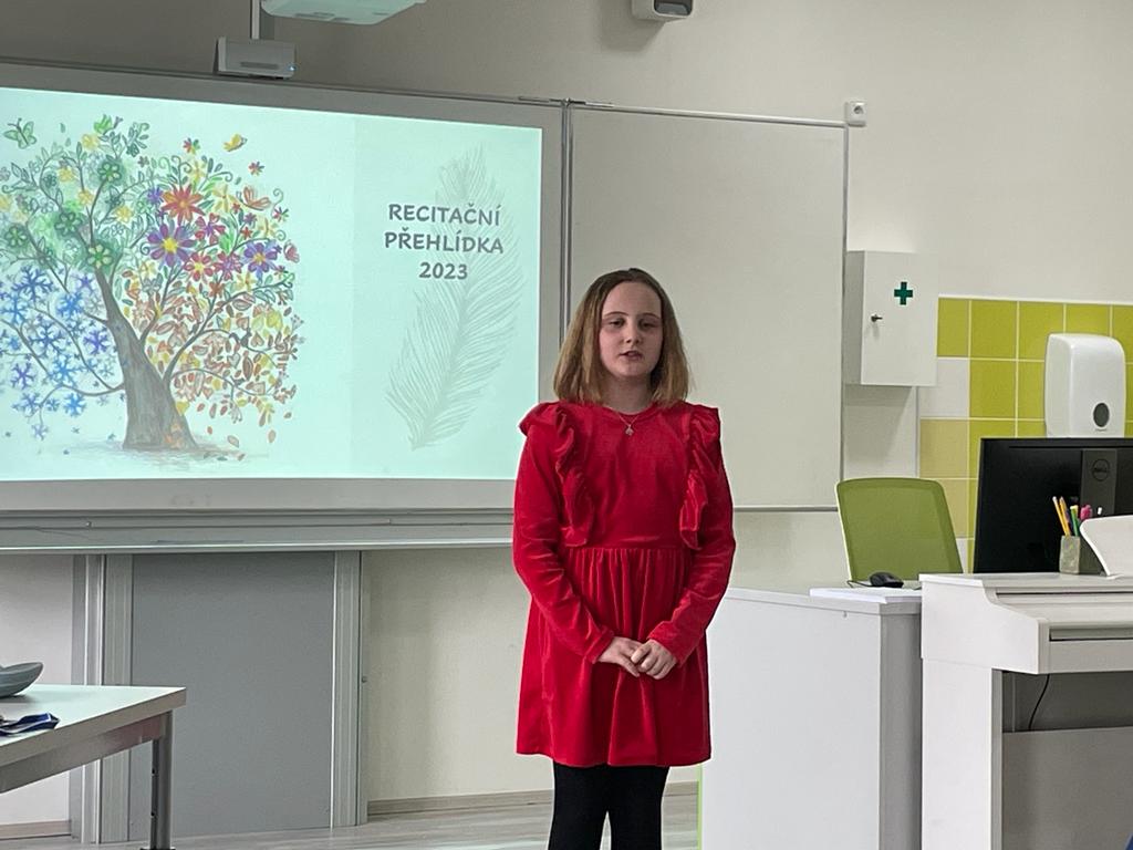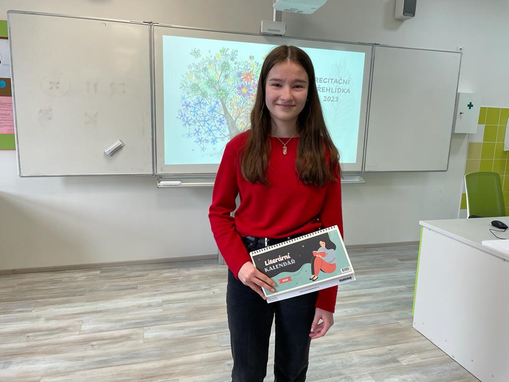 Zvláštní ocenění za výběr textu a jeho procítěné podání získala – Veronika Grumlová (9. B).
