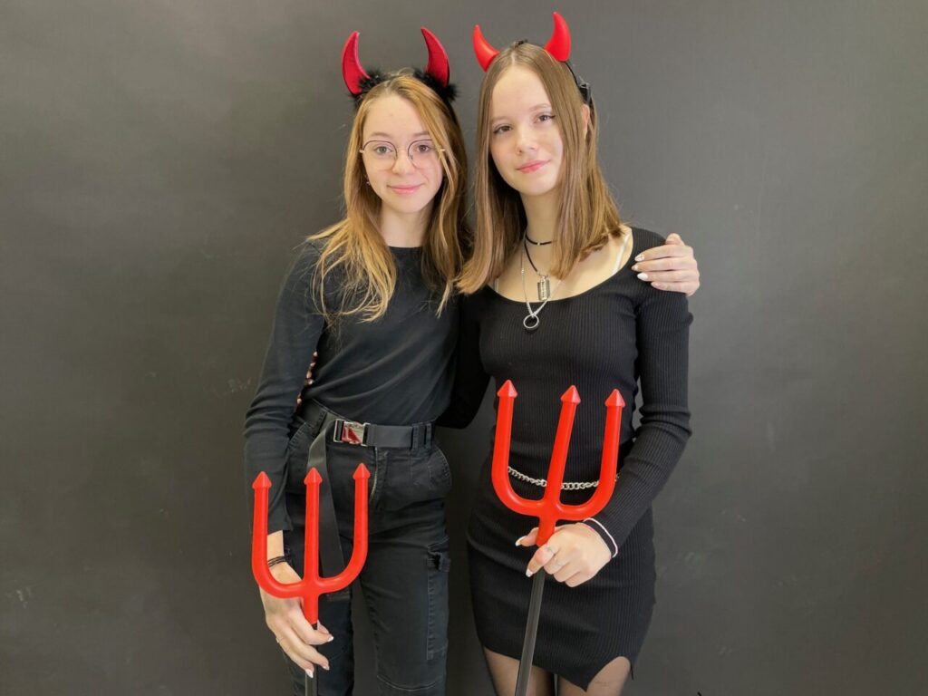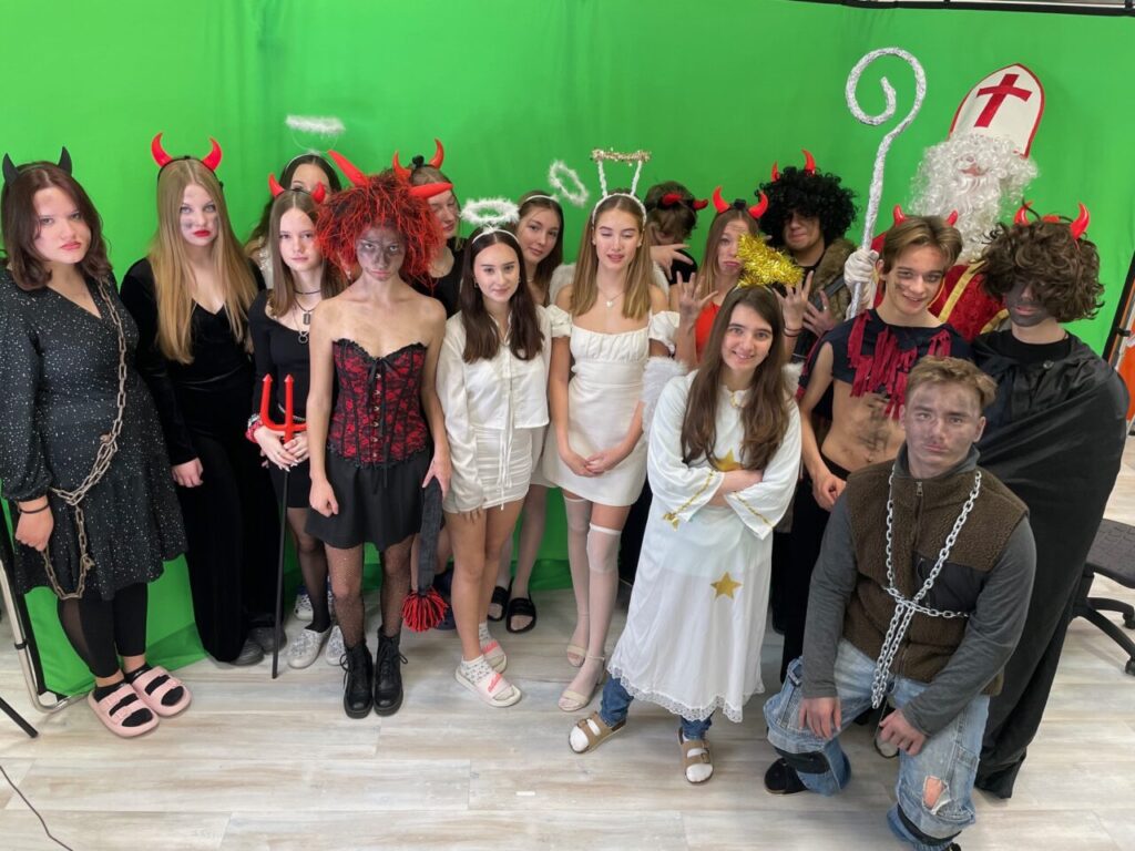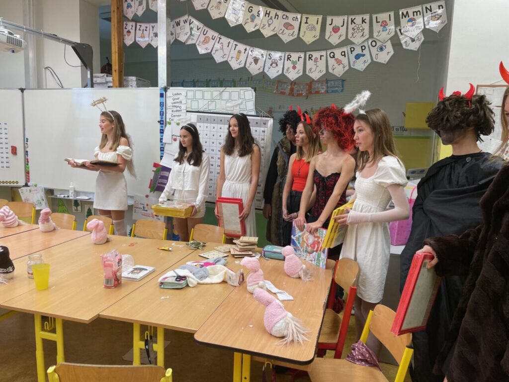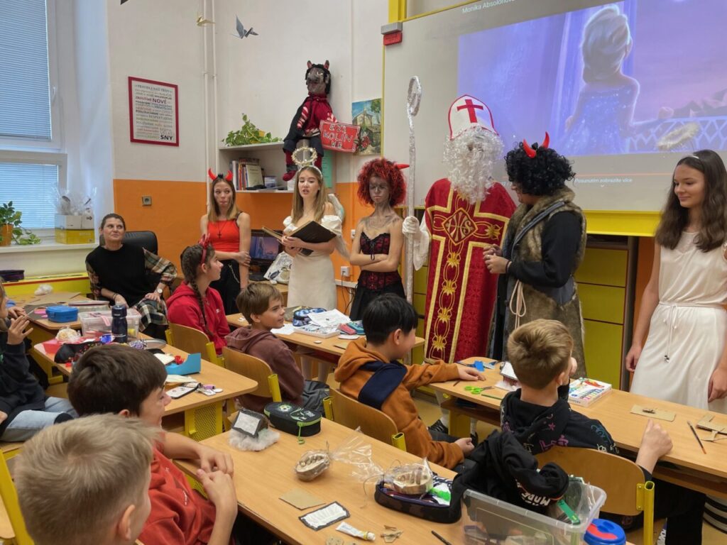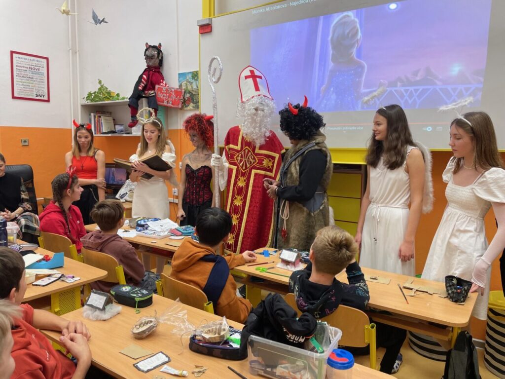9. A a i 9. B  jako každý jiný rok se převlékli za čerty, anděly a v každé třídě byl jeden Mikuláš. Chodilo se druhou a třetí vyučovací hodinu, od první třídy až do osmé. Andělé četli z knihy hříchů, ti co zlobili nám slíbili, že se určitě polepší, budou dávat pozor a samozřejmě budou poslouchat paní učitelku. Abychom jim hříchy mohli odpustit, zazpívali nám písničku, nebo řekli básničku. Někteří andělé a i čerti rozdávali odměnu a poté jsme všem zamávali a popřáli hezký zbytek dne.