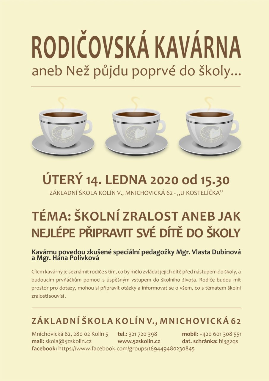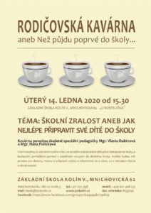 Tentokráte se rodiče mohou těšit na povídání na téma ŠKOLNÍ ZRALOST ANEB JAK NEJLÉPE PŘIPRAVIT SVÉ DÍTĚ DO ŠKOLY. Kavárničku budou již tradičně moderovat naše zkušené speciální pedagožky – Mgr. Vlasta Dubinová a Mgr. Hana Polívková.