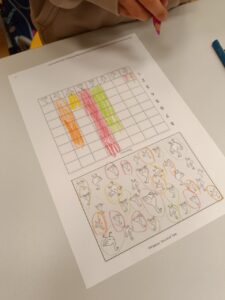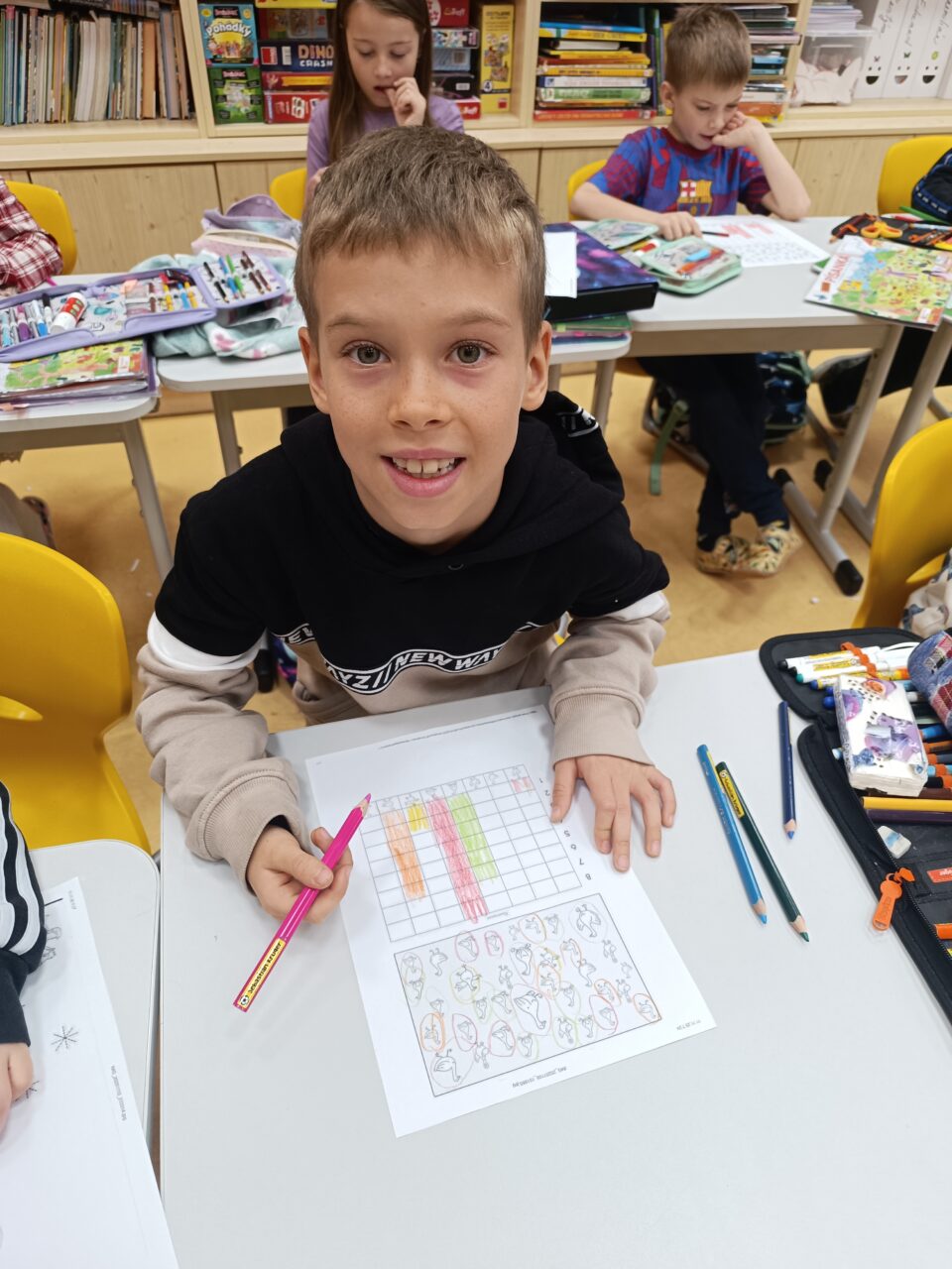Proč se jí v tomto období husa? To jsme se dozvěděli ze zpráviček z Déčka. Husičku jsme si obtáhli jedním tahem. A na druhé kopii jsme si je spočítali. Vznikl nám první sloupcový graf, který nám počet husiček přehledně zevidoval. 📊
