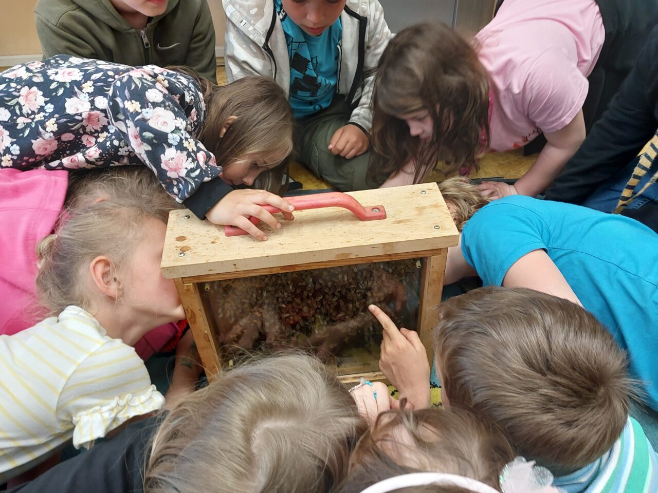V rámci předmětu Člověk a svět se mohli žáci dozvědět mnoho zajímavého o včelách přímo od včelaře a prohlédnout si, jak to vypadá v jejich „domě“ díky prosklenému úlu. Bylo vidět zásoby medu a pylu, pracovité včely dělnice, několik trubců a někteří měli to štěstí, že zahlédli i včelí královnu. Na plástvích se zrovna líhnul plod, a tak nejvíce zaujaly právě vylíhnuté a z buněk se vykusující dělnice. Pozorovat život v úle měly možnost i další třídy.