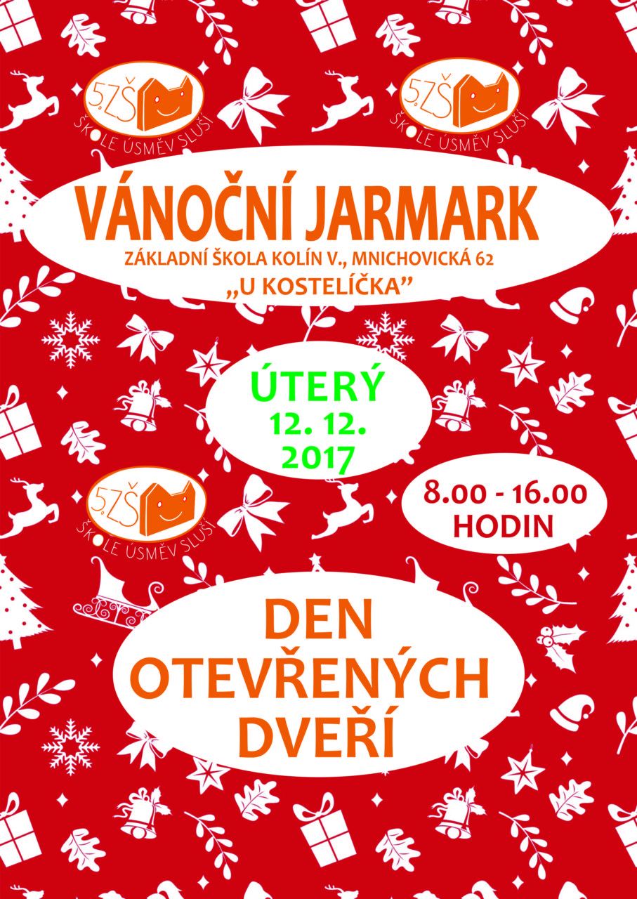 Srdečně zveme v ÚTERÝ 12. PROSINCE OD 8 do 16.00 hodin BÝVALÉ KOLEGY, absolventy školy, rodiče našich žáků a všechny příznivce školy na již tradiční a proslulý VÁNOČNÍ JARMARK, který bude zároveň i DNEM OTEVŘENÝCH DVEŘÍ. Těšíme se na vás…