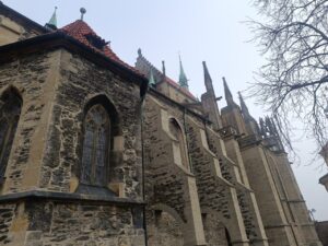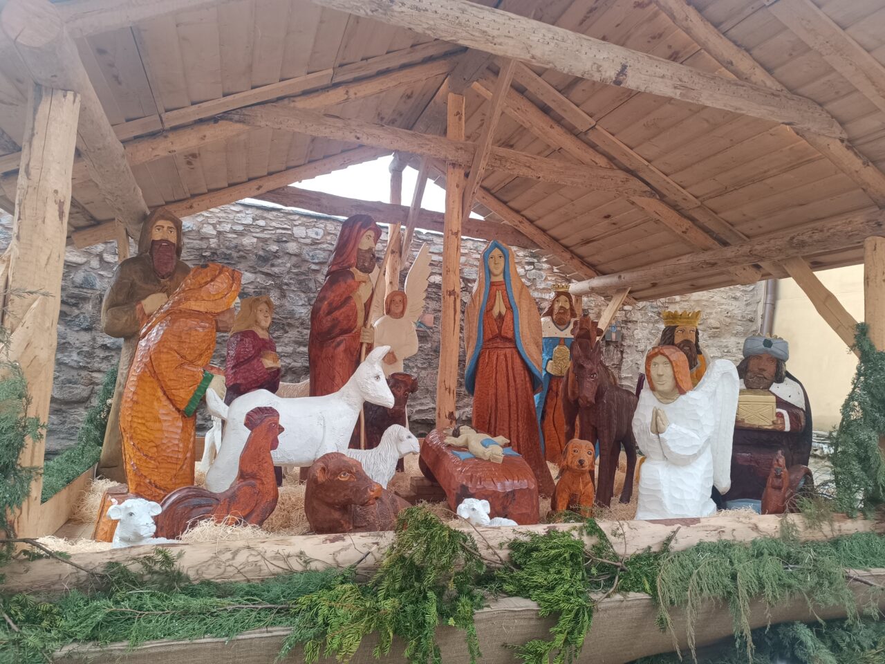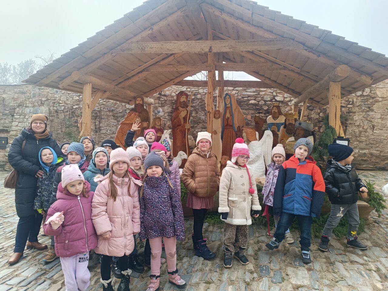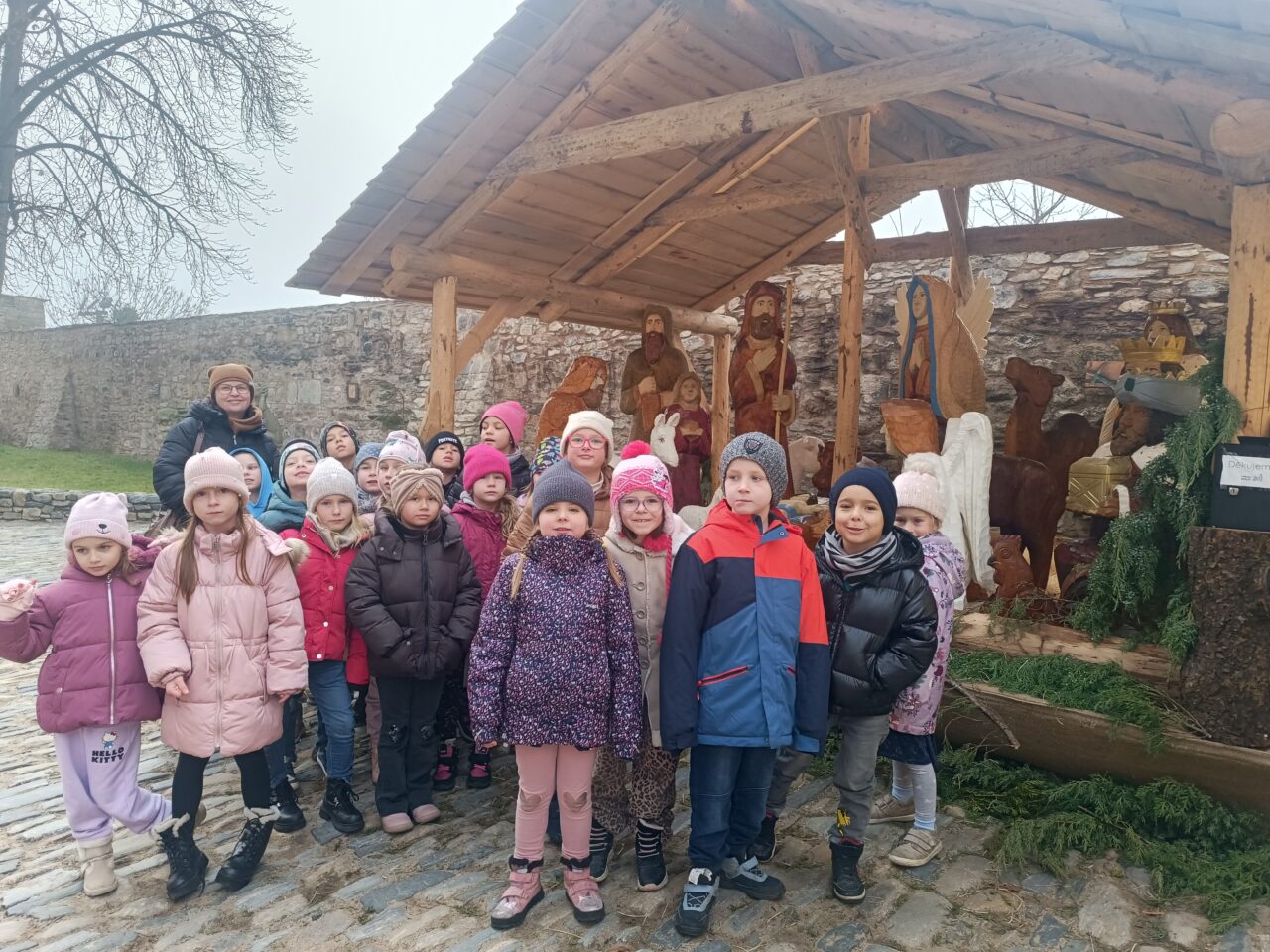 Při zpáteční cestě do školy jsme se zastavili u dřevěného betlému.