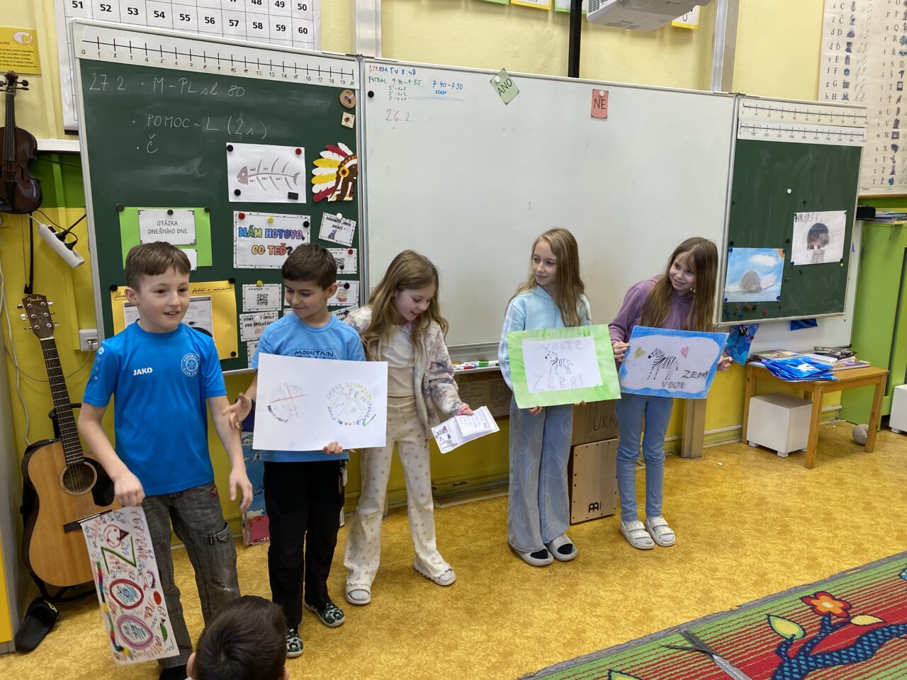 V minulých dnech si žáci 3.A v rámci prvouky hráli na zvířata v ZOO, kde probíhaly volby. Příprava tohoto projektu jim zabrala 2 týdny. Kandidovaly 4 strany – Lemuři, Lvi, Hroši a Zebry. Při volební debatě, které se zúčastnili žáci 8.A, všechny strany představily svůj volební program a kandidátní listinu. Také se musely popasovat se všetečnými otázkami pozvaných hostů. Poté už následovaly samotné volby. Každý volič musel předložit občanský průkaz, pak teprve dostal volební lístek, který mohl následně hodit do volební urny. Vyhráli Lemuři, kteří si dohodli koalici se všemi dalšími stranami. Doufáme, že se nám v ZOO bude po volbách lépe žít.